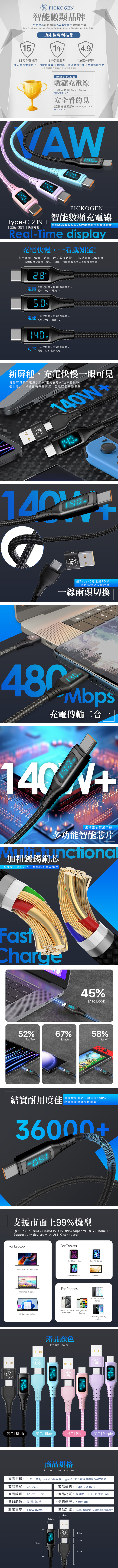 PICKOGEN 皮克全 140W快充 二合一 雙Type-C/USB-A TO Type-C PD充電傳輸線 VAW數顯 QC4.0 神速 1.2M