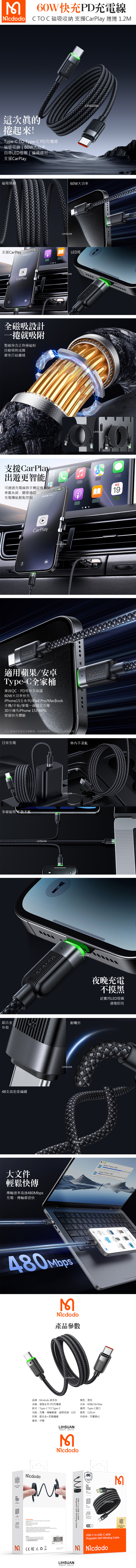 ●磁吸收納|60W大功率|自帶LED燈圈|編織線材|支援CarPlay