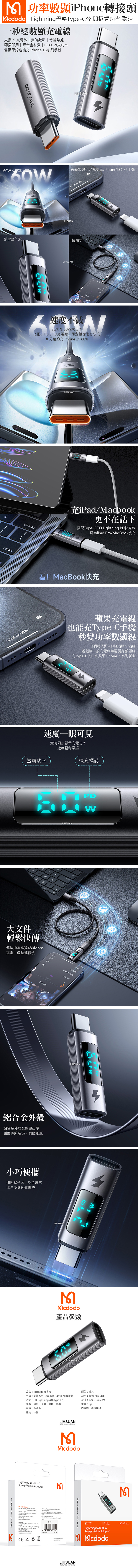 Mcdodo 麥多多 PD/Lightning/iPhone 轉 Type-C 快充 轉接頭 轉接器 功率數顯 勁速系列